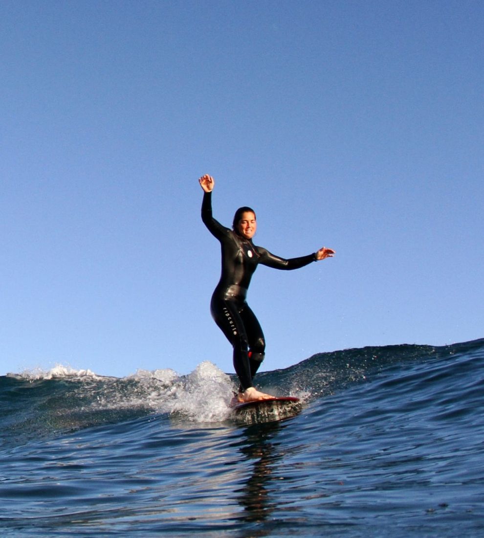 Desde pequeñita entré en el mundo del deporte, con sólo 4 años comencé a nadar y más tarde fui nadadora a nivel competitivo hasta los 18. En la actualidad mi pasión es el surf, pero también hago skate, senderismo y entrenamiento funcional.